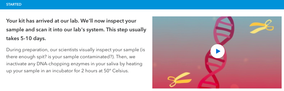 I put my test in the mailbox the day after my birthday, and have been checking for updates. I was excited to see my kit has been received!