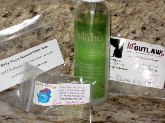 You can also make your own solution. A quick google search will yield tons of “recipes,” most of which contain some variation of: soap or baby wash, water, oil and essential oil. There are recipes that include aloe vera juice, chamomile, honey and other ingredients to serve specific purposes. Homemade solutions can be used to moisten select-a-size paper towels (cut the roll in half) for a frugal disposable wipe solution as well!