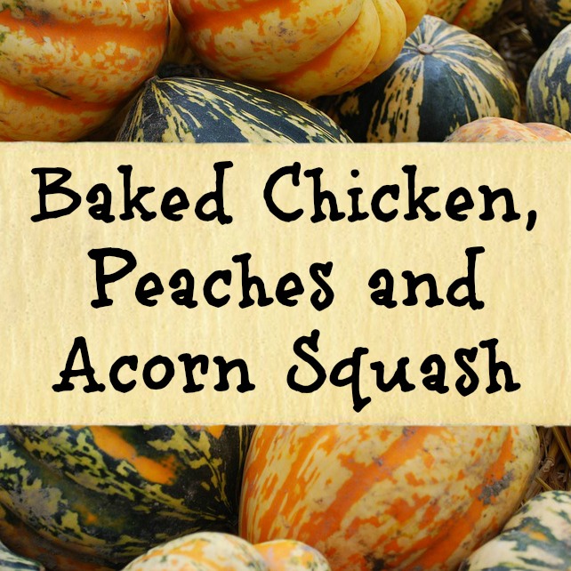 2 small acorn squash 4 garlic cloves, minced 2 T olive oil, divided (the recipe calls for canola or vegetable oil but I use olive oil) 4 skinless boneless chicken breasts (the original recipe calls for 4 chicken drumsticks and 4 bone-in skinless chicken thighs) 1/4 c packed brown sugar 1 T minced fresh rosemary (or 1 tsp dried rosemary, crushed) 1 tsp salt 1 can (15-1/4 ounces) sliced peaches, not drained