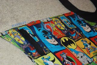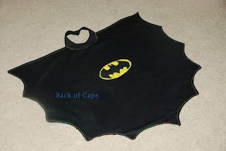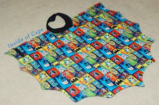 So, for Noah, I designed and made a durable double sided scalloped cape that is lined in a black polyester and the lining is a Batman print that I found at Hancock Fabrics in their remnants!