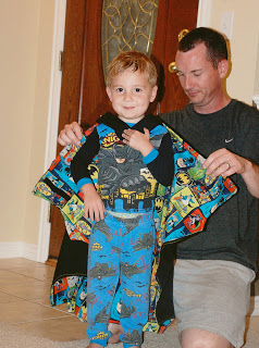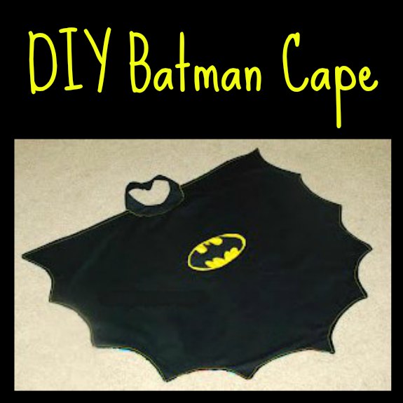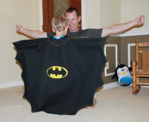 I measured Noah’s wingspan and the length from his neck to the bottom of his feet and cut a half moon to create the general shape of the cape. Then I cut scallops into the fabric. I did the same thing with the Batman fabric. I then sewed the pieces together, used extra fabric to create handles and then designed and stitched on a Batman logo….triple layered.
