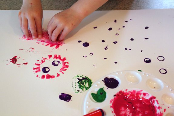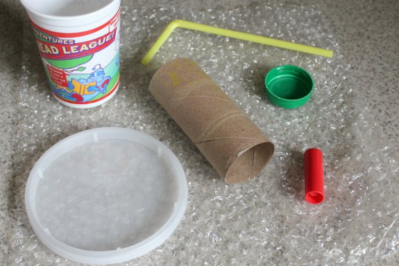 Start by gathering up any materials that you can use for painting. This could be just about anything: toilet paper tubes, bubble wrap, marker caps, old yogurt cups, lids, empty water bottles, straws, corrugated cardboard, and so on.