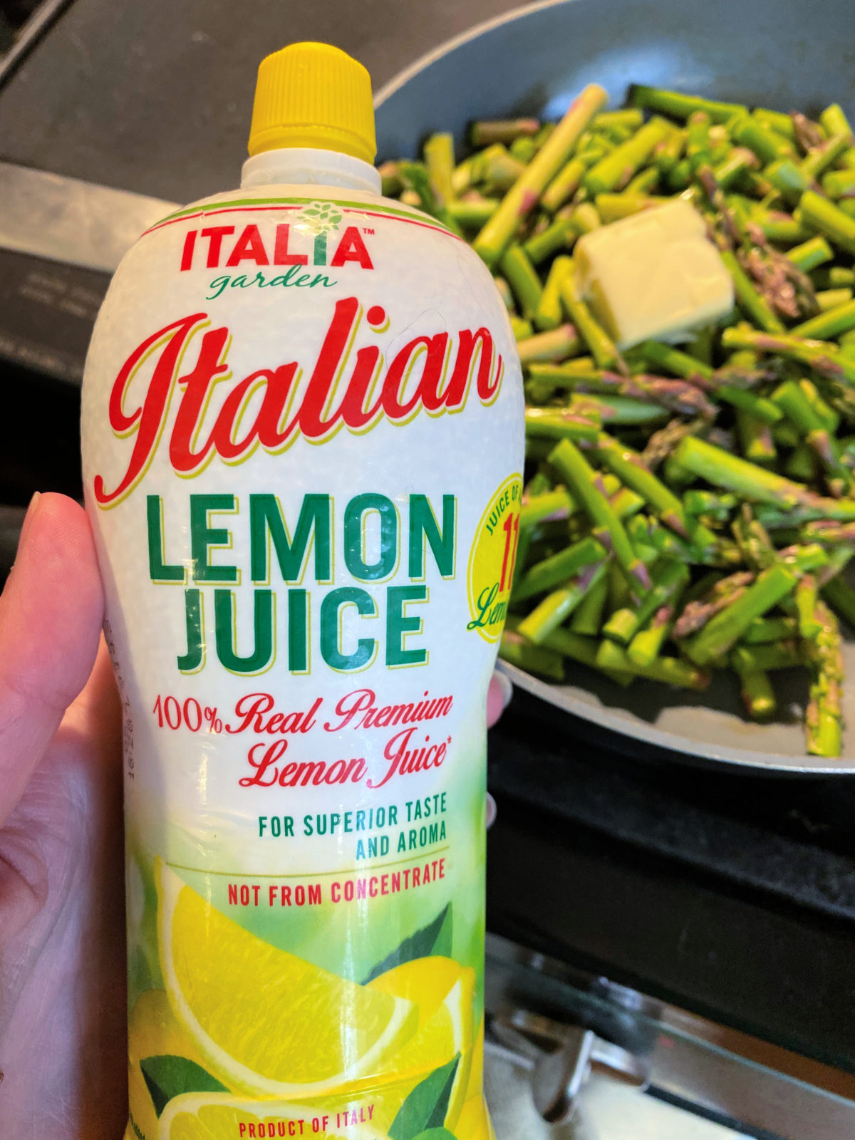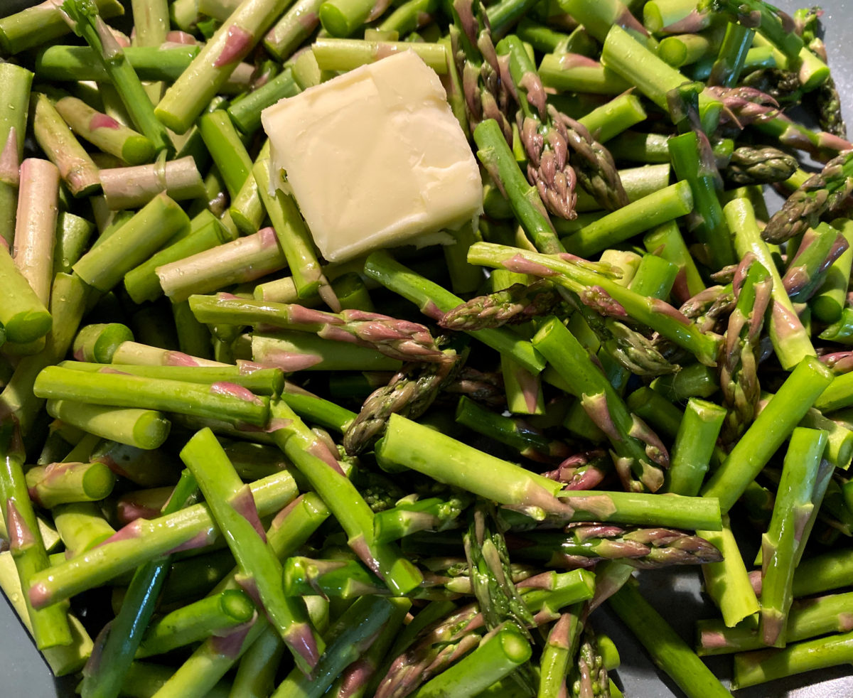 Place in a pan medium-high heat with the butter and lemon juice. Stir occasionally so that the asparagus cooks evenly. You may need to add more lemon juice or even water as the liquid cooks off (you can cover intermittently to help retain moisture).