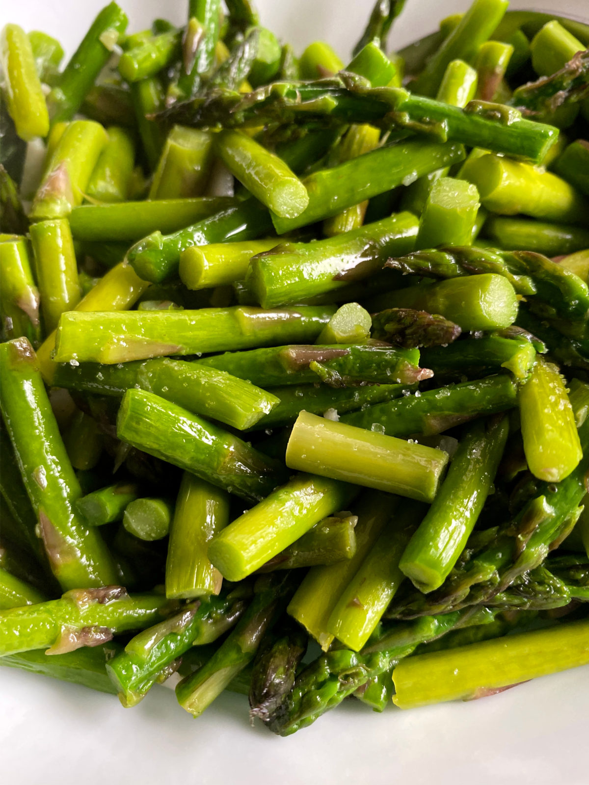Remove from heat as soon as the asparagus begins to appear “wrinkly” or start to turn brown, which should be about 5 minutes or less. We like our asparagus cooked lightly, just enough so that it doesn’t get stringy or tough, and stays fresh and crunchy.