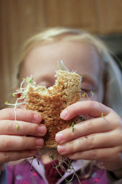 Sprouting is a great activity for children to participate in. Since sprouts grow so quickly, it is a teaching tool to show kids the process of growing. My kids like a toasted pita pocket or toasted bread with some mayonnaise and sprouts.