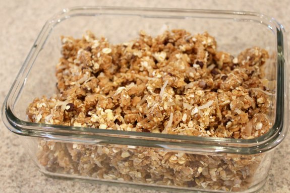 I actually store this in the fridge as sort of “granola” type form in a container, but you can also use your hands to roll the mixture into little balls or bites.