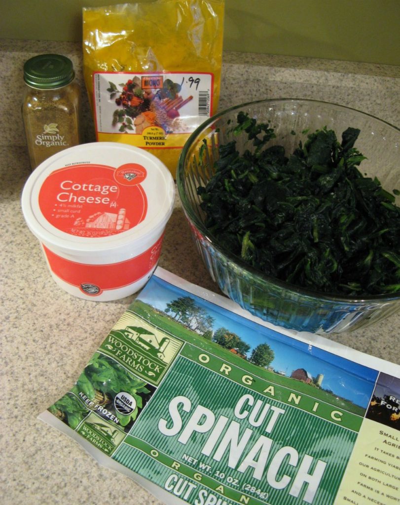 Preparation is very easy. I heat the spinach in the microwave until it is warm, and mix the bag in a bowl with the cottage cheese, sprinkling with the cumin to taste. You may want to do less cottage cheese (like 8 oz), or you can try some sour cream instead. I use what is on hand, what is convenient – and with cottage cheese, my toddler will gladly eat the leftover cottage cheese.