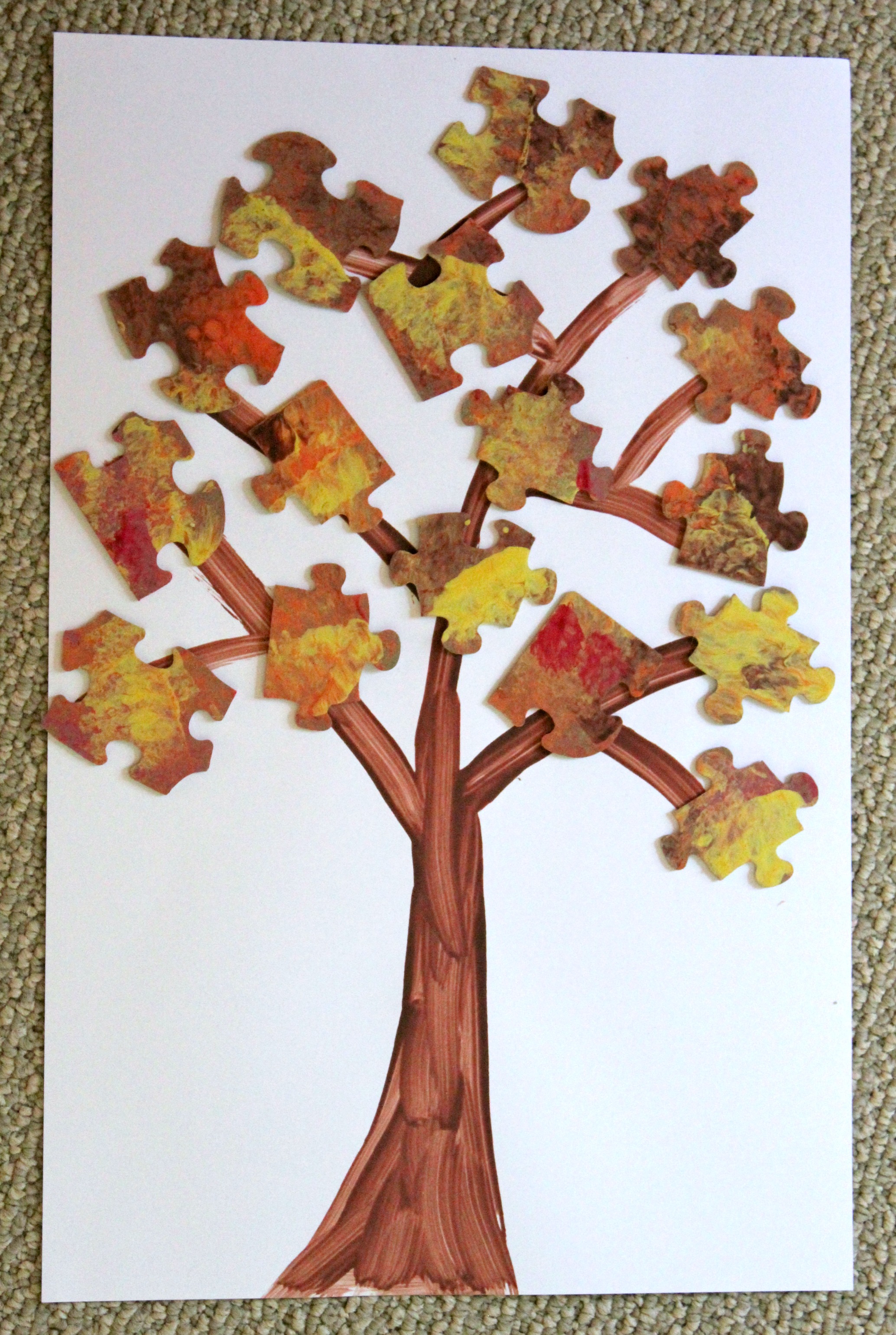 I am always trying to think of what to do with all our old puzzles that have missing pieces. I hate to throw them out, so we decided to make fall trees. This is a great way to upcycle materials that would get thrown out.