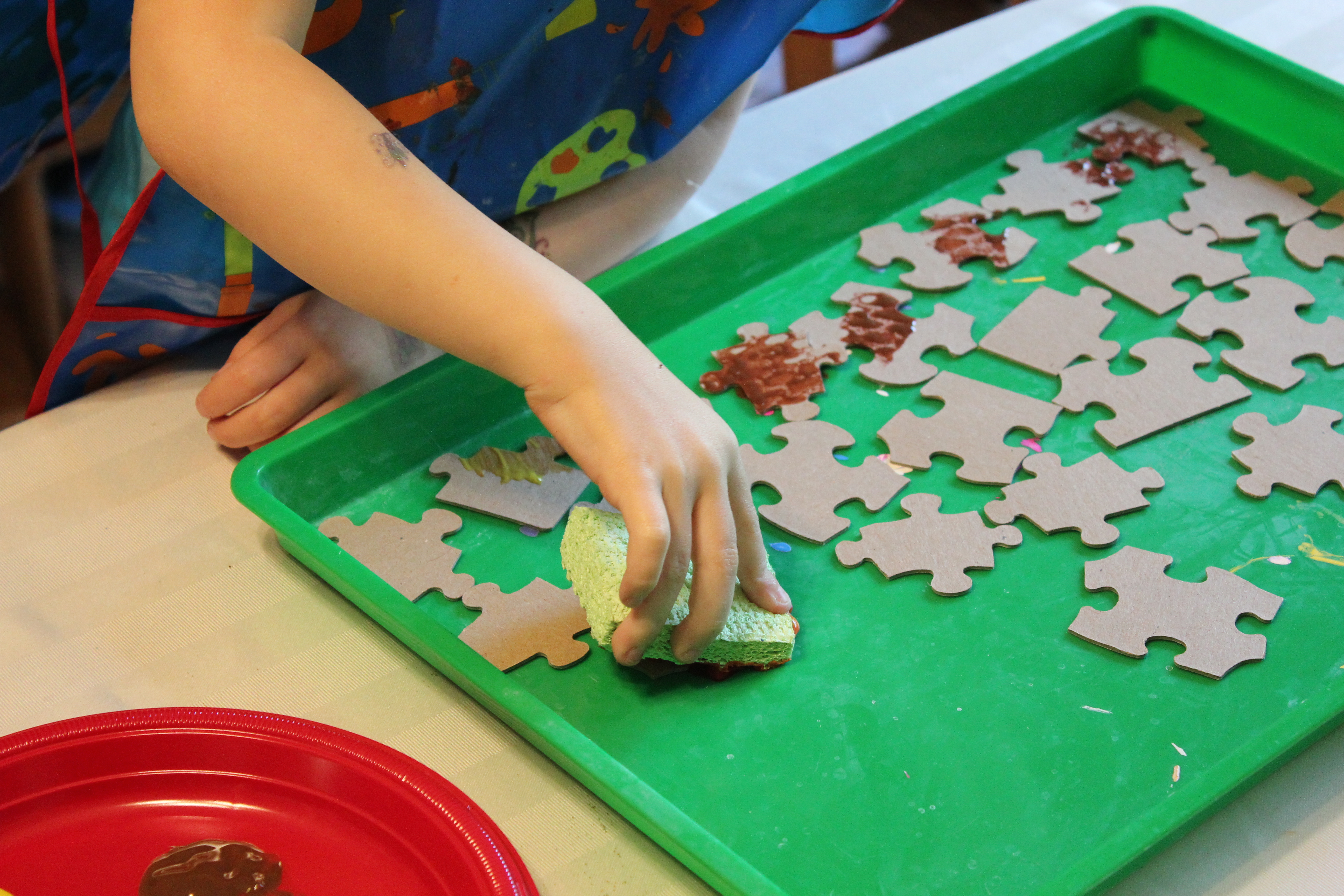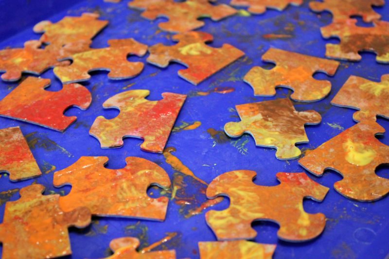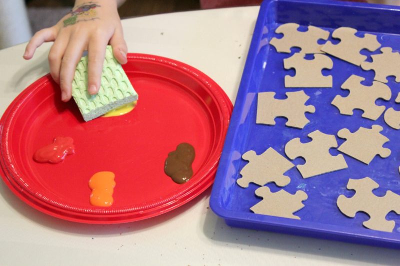 You can do different variations on this project, from how you paint the puzzle pieces (sponge painting, layers of colors, etc), to what colors you use. We also used large puzzle pieces, because it was the only size we had, but this project would also be great with little puzzle pieces. Have fun with it and be creative!