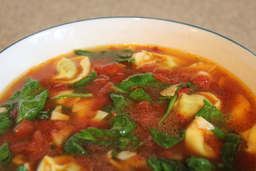 When the tortellini is almost done, stir in your spinach. You don’t need to really cook it much, as the fresh spinach will wilt down fairly quickly.