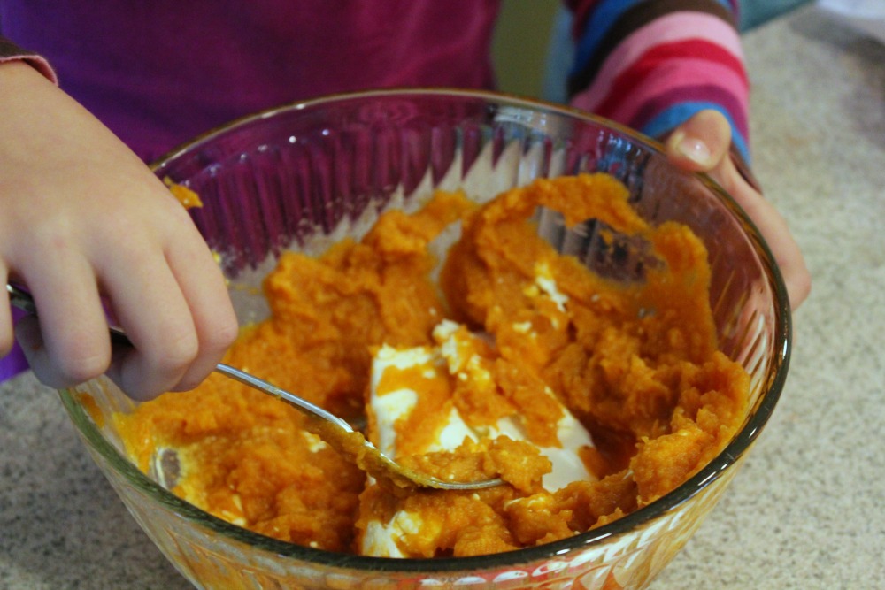 This is a really easy pumpkin dip recipe that even the kids can help make! My daughter made this at preschool, and the kids made their own version they enjoyed squishing the ingredients together in a ziploc bag!