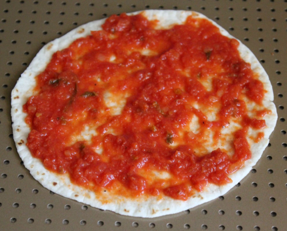 Add your sauce. If I don’t have pizza sauce on hand, I use marinara sauce, and kids don’t seem to mind as long as it isn’t too watery.