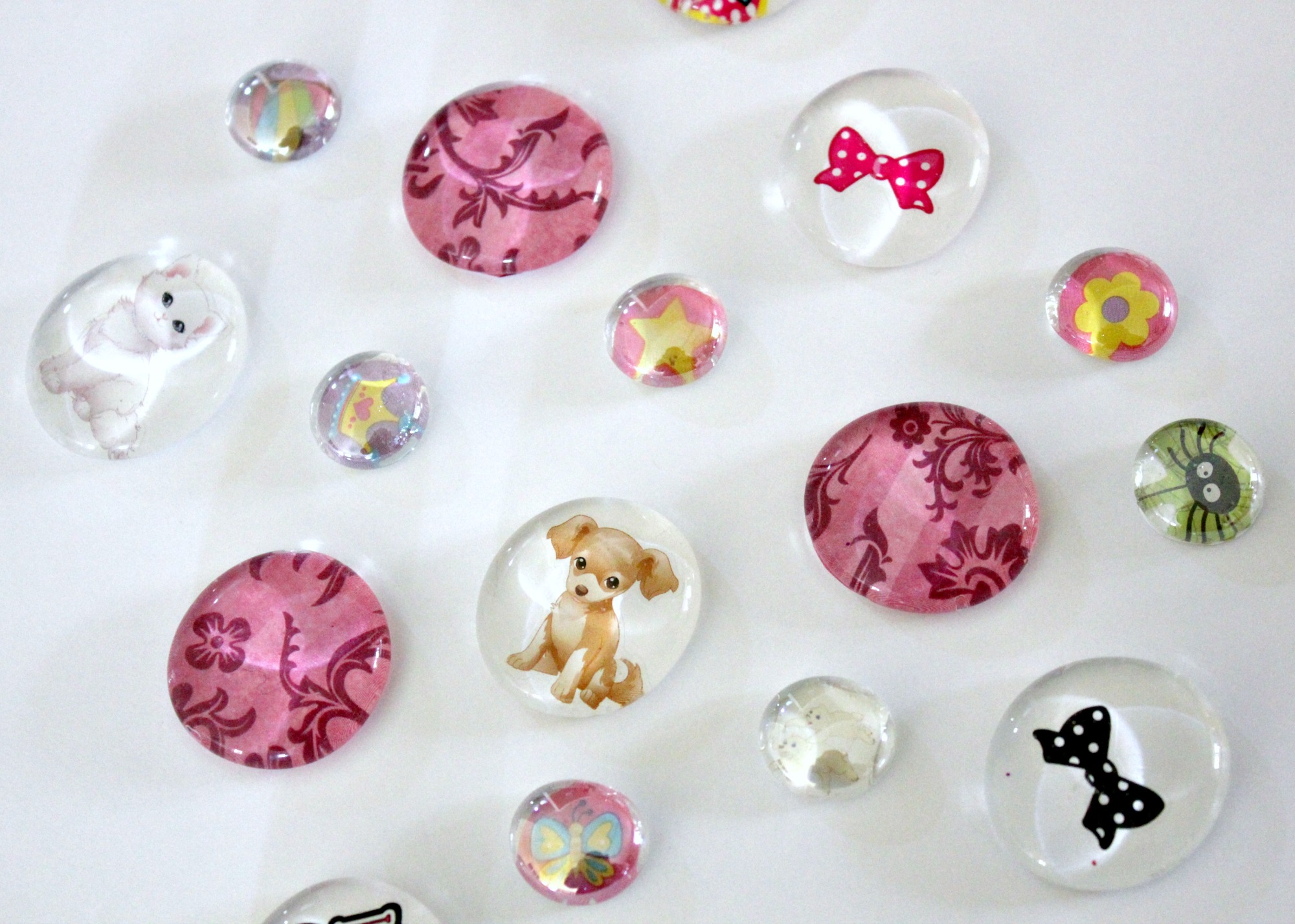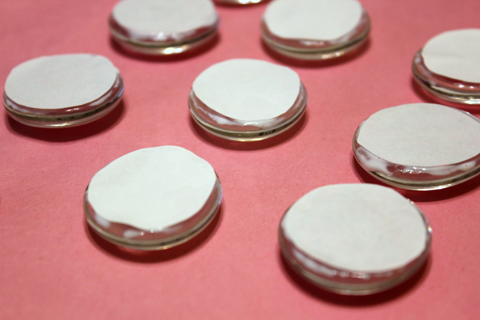 Choose your images and glass stones. Trace around the glass and then cut your paper. You may have to trim the paper circles, since the glass stones are usually rounded, and you want the paper to fit on the back (and not stick out the sides).