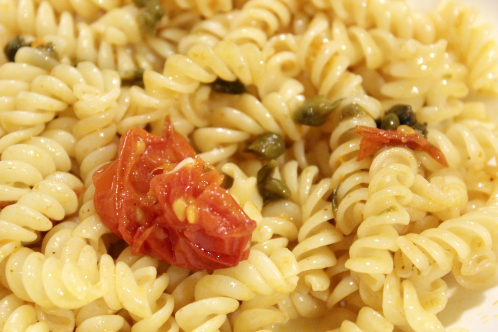 Cook your pasta. Drain and return to the pot with some butter (for a vegan recipe, use a non-dairy alternative). Turn on the heat and toss with the roasted tomatoes and capers, mixing thoroughly to coat the pasta. If desired, add salt (but generally the capers should provide enough salt).