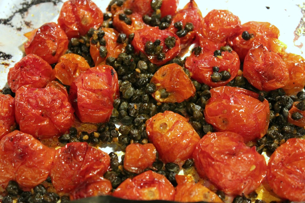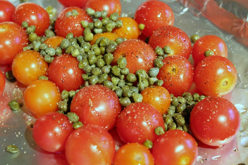 Toss tomatoes and capers (drained) with olive oil on a baking sheet (use a baking sheet with a lip, and you may want to line with aluminum foil to minimize cleanup). Season with pepper.