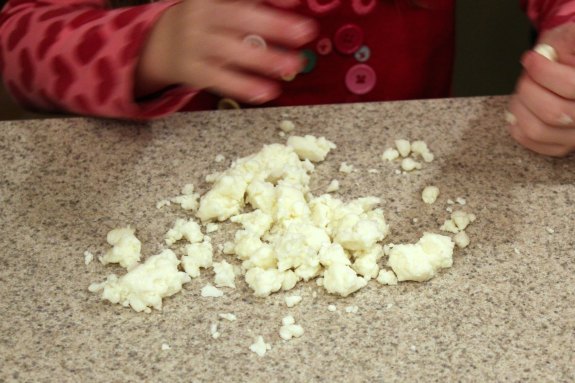 This is a fun winter version of play dough. It has a very cool sensory feel to it, and feels very silky and is crumbly.