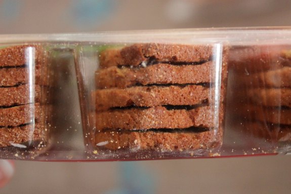 The cookies come carefully packaged. They are thin, but very crunchy. I like the crunch and that the nuts add a different texture to the cookies.