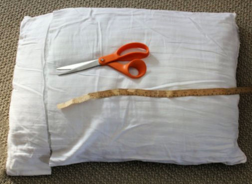 The bed pillow I used measured 20″ wide by about 25″ long, so I cut the pillow to make it square.