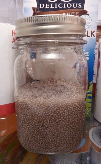 Combine the chia seeds and water. I shake my jar, but you can stir vigorously. This is just after a few minutes, but I allow this mix to sit overnight because the mixture will become very thick, and the chia seeds should absorb all the water.