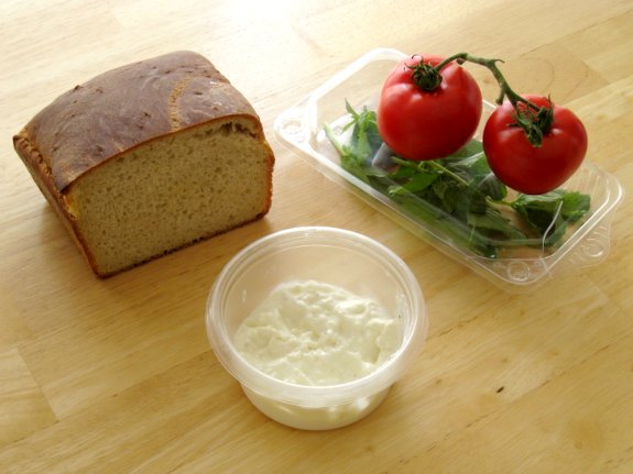 Bread (I made my own homemade Bread using the recipe here, but you could use a baguette or other bread) 1/4 cup Feta cheese 1/4-1/2 cup reduced fat sour cream 1/2 of a fresh squeezed lemon Black Pepper, to taste 1 small thinly sliced tomato 3 chopped mint leaves (or you can use basil instead)