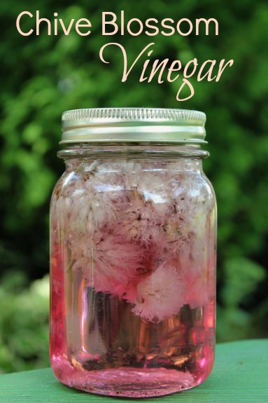 ** I read here that you don’t want to use a metal lid (such as a mason jar lid) because the vinegar will erode the finish, and I don’t like to have plastic come in contact with such an acidic food, so be careful about what kind of lid you use or filling the jar to the top. I used a mason jar lid with the plastic coating on the underside, and I had to throw it out because the scent of the chive vinegar was so strong and I couldn’t wash it away (despite multiple washings and soakings).