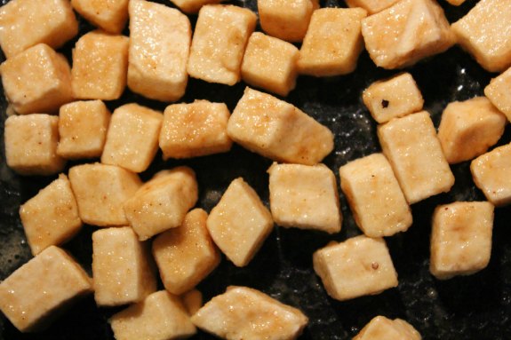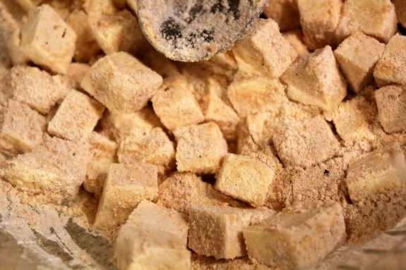 Warm your oil in a skillet. Roll the tofu in the dry mixture. Don’t be afraid to heavily coat.
