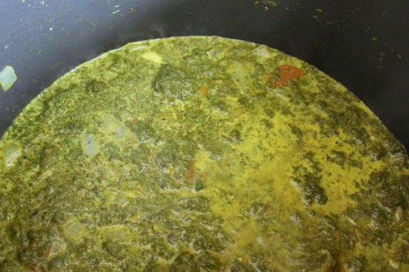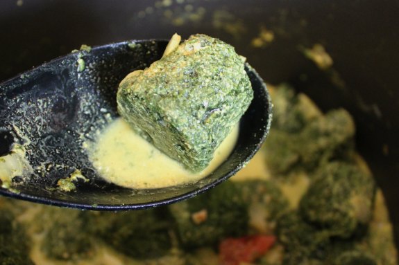 Here you can see what the frozen blocks of spinach look like. Alternately, you can microwave the blocks in a bowl before adding to the pot, but I had no problem cooking them down as long as I kept stirring often.