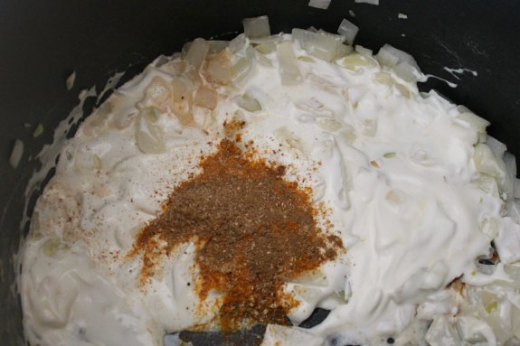 Add the sour cream and spices. You can always add more sour cream if you want a creamier recipe.
