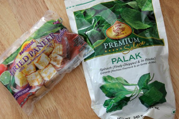 For this recipe, I got the two main ingredients at our local Indian grocery store. Paneer comes in different varieties. You can get it as a solid block that needs to be cut up and fried, or you can get pre-fried paneer (like the one below). I also buy frozen palak, which are large cubes of finely chopped spinach. By finely chopped – it is not like any chopped spinach I have ever bought at my grocery store – I would say it has already been pureed and then frozen.