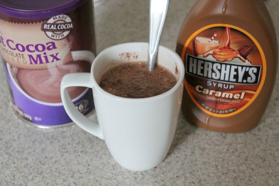 To start, prepare a hot cocoa like you normally would. Once your mug is ready, add in at least 2 tablespoons of caramel sauce and a dash of salt. I literally just squeeze caramel topping on a spoon and mix it in to taste. The first time you make this, give it a taste to see how strong you like the caramel flavor.