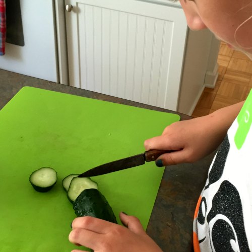 As a vegetarian family, the first recipe we tried was the “Chop Chop Salad”. The recipe gives you options for toppings and we started with cucumbers. My daughter also added shredded cheese and tomatoes. Even though she is 8, we haven’t let her use a knife very much, so this was good practice for both preparing food and skills in dexterity as well as being safe in the kitchen. She was very good with using a knife and I used this opportunity to go over things like tucking in her fingertips and not cutting close to her hand.