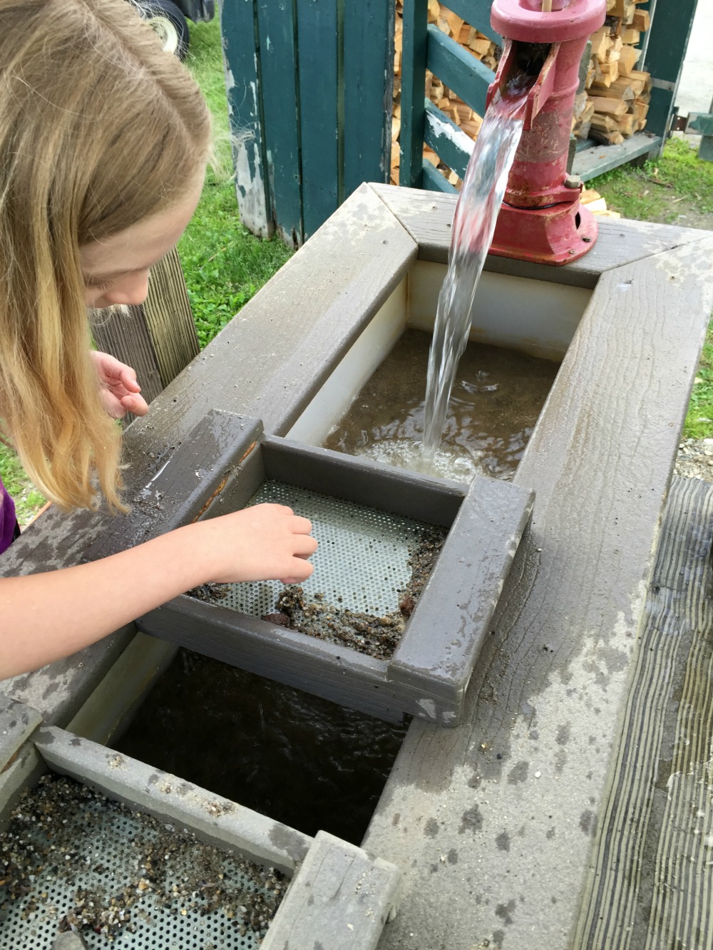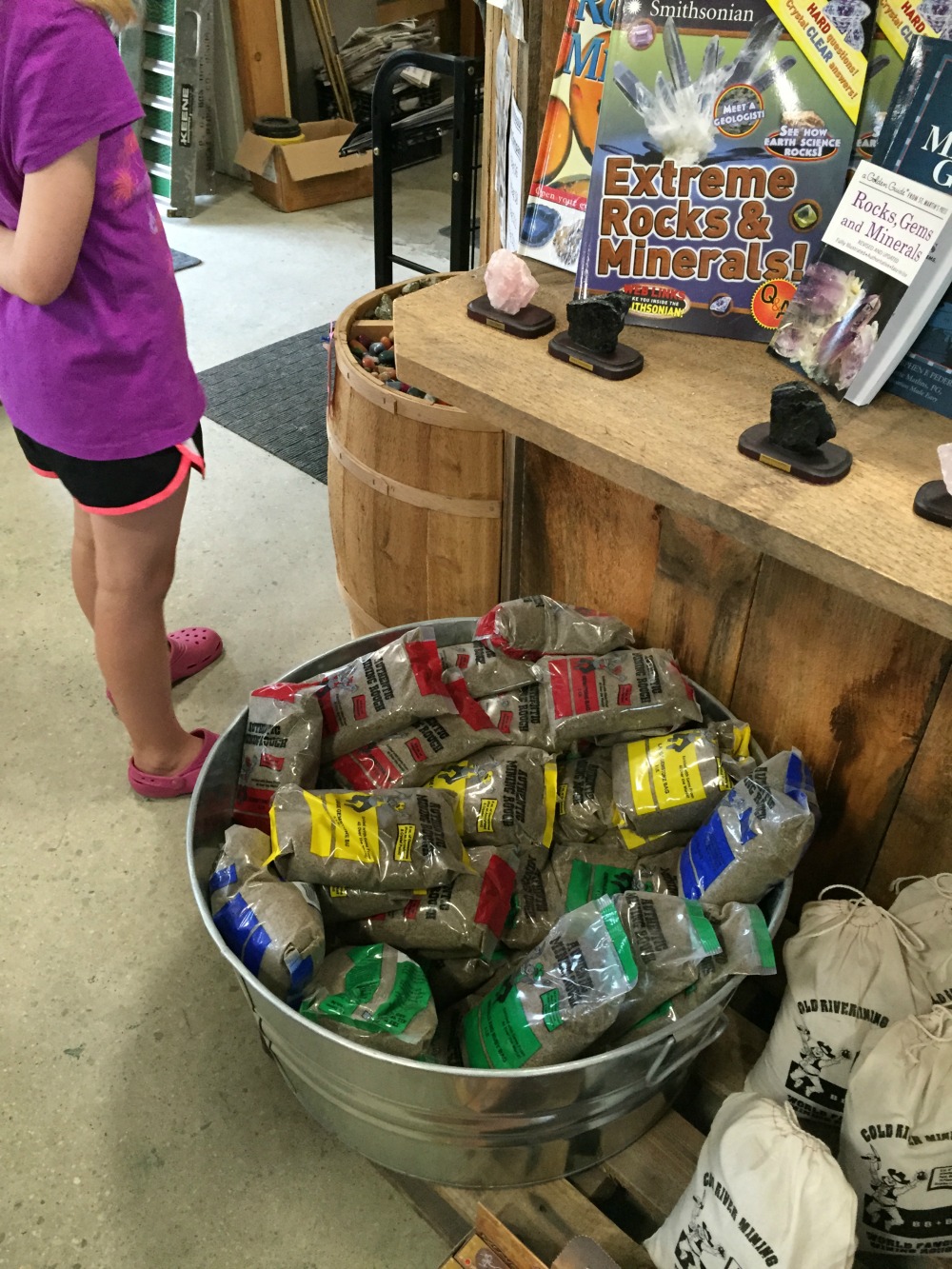 This area in New Hampshire is known as being a good place for gold panning. Not only do they sell true goldpanning supplies, but they also sell kits and bags of material for using with their sluice. Some kits have bits of gold flakes, and we chose one with fossils, which was pretty cool.