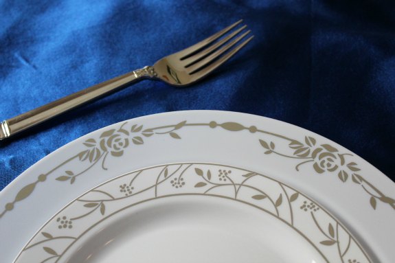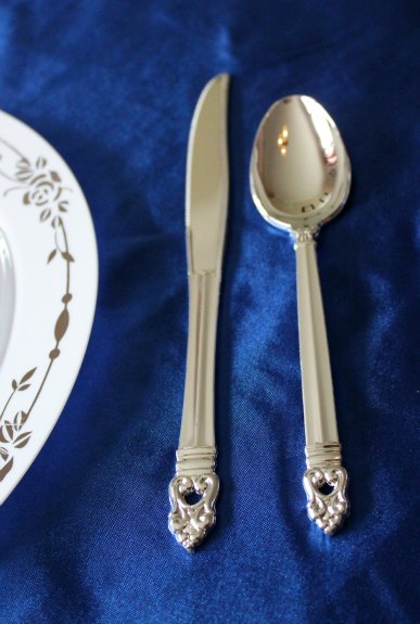 The color theme of this set are so nice, with combinations of white, silver, and blue. The colors of the linens, with the satin finish of the fabrics and the silver on the plates and utensils all tie in so nicely together.