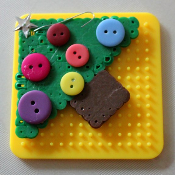 You can decorate your Christmas tree with whatever you like. Alternately, you could simply use different color Perler beads in the actual pattern as the ornaments. We glued on buttons and a star sequin as a tree topper, but you could use anything from sequins to pom poms, beads and more.