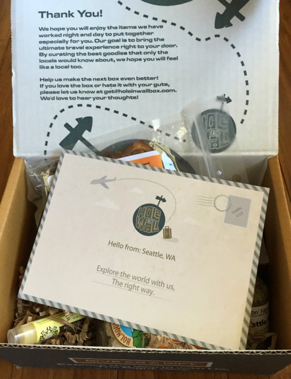 I had a chance to try the Seattle box. Seattle actually has a lot of meaning for me because I visited family there as a young child, and although I haven’t been back, our close family members are moving there. I hope to make it out that way in the next few years, but in the meantime, I can check it out through my Hole in the Wall Box.