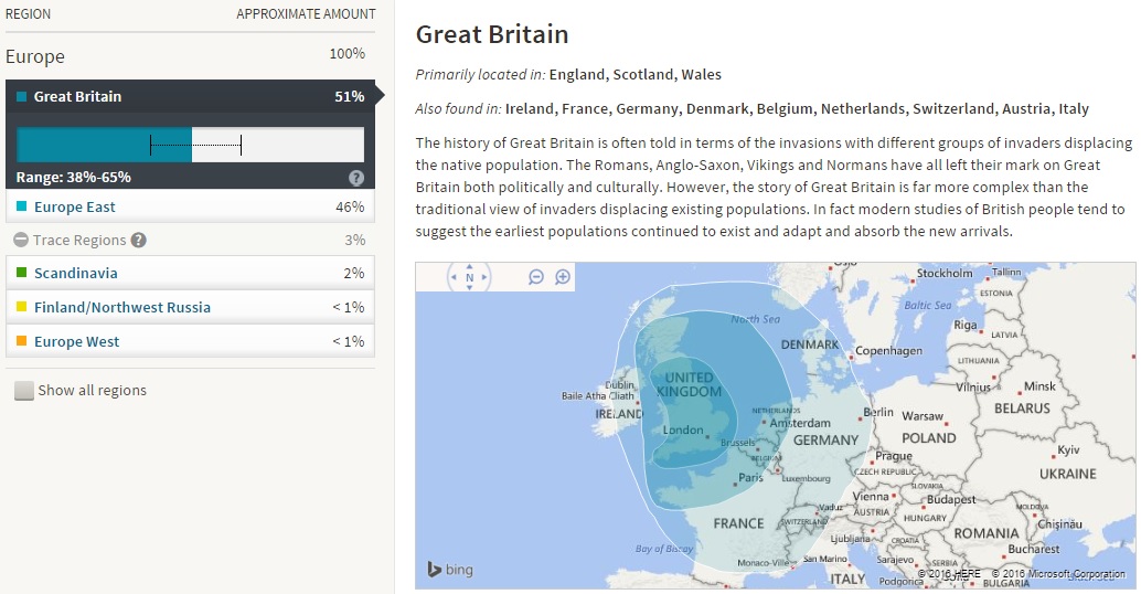 There are lots of tools to help break down your ethnicity – like a breakdown with maps. So as you can see, I am “51% Great Britain”, and that likely includes England, Scotland, and Wales, but can include other countries. I do know I have ancestors from the Isle of Man, so it helps to solidify those connections.