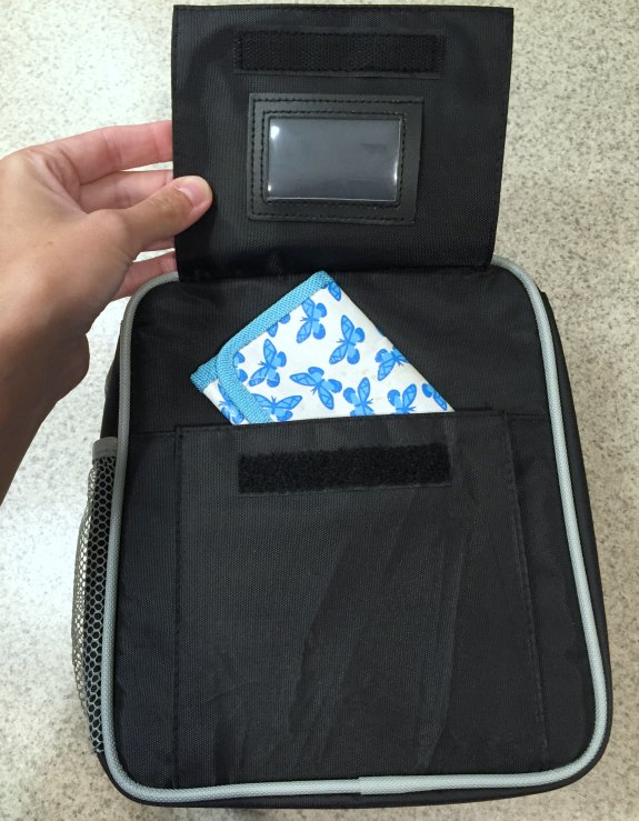 I love all the storage on this bag. Most of our lunch boxes are simply one compartment, maybe with a pocket on the outside. This lunch box has a number of pockets, including a large one on the back, a zippered pocket on the front, and a mesh pocket on the side. A great way to include extras, like utensils, napkins, notes, or other things. The larger pocket is perfect for my daughter’s wallet, since the kids do a banking program once a week at lunch time.