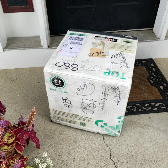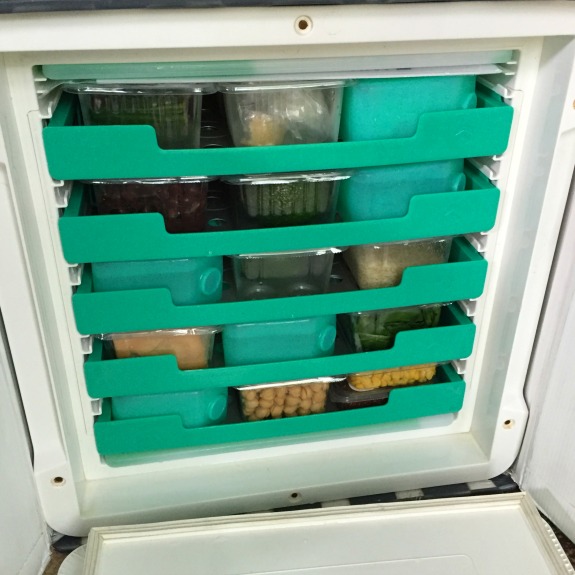 The meals arrive in this really cool fridge-like cooler! The neat part is, you peel off your shipping label to reveal a return label, set it out on the porch the next morning, and it gets picked up and returned.