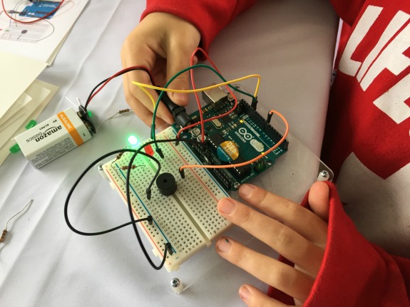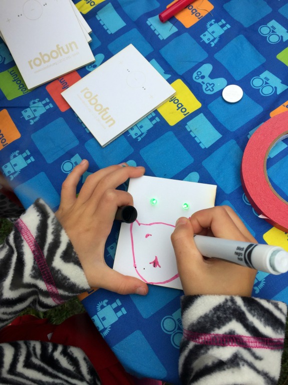 At this Robofun station, my girls put together a little circuit with LEDs (you can see the lights sticking up through the front). They were able to make any design of their choice, which was a great way to get their creativity going.