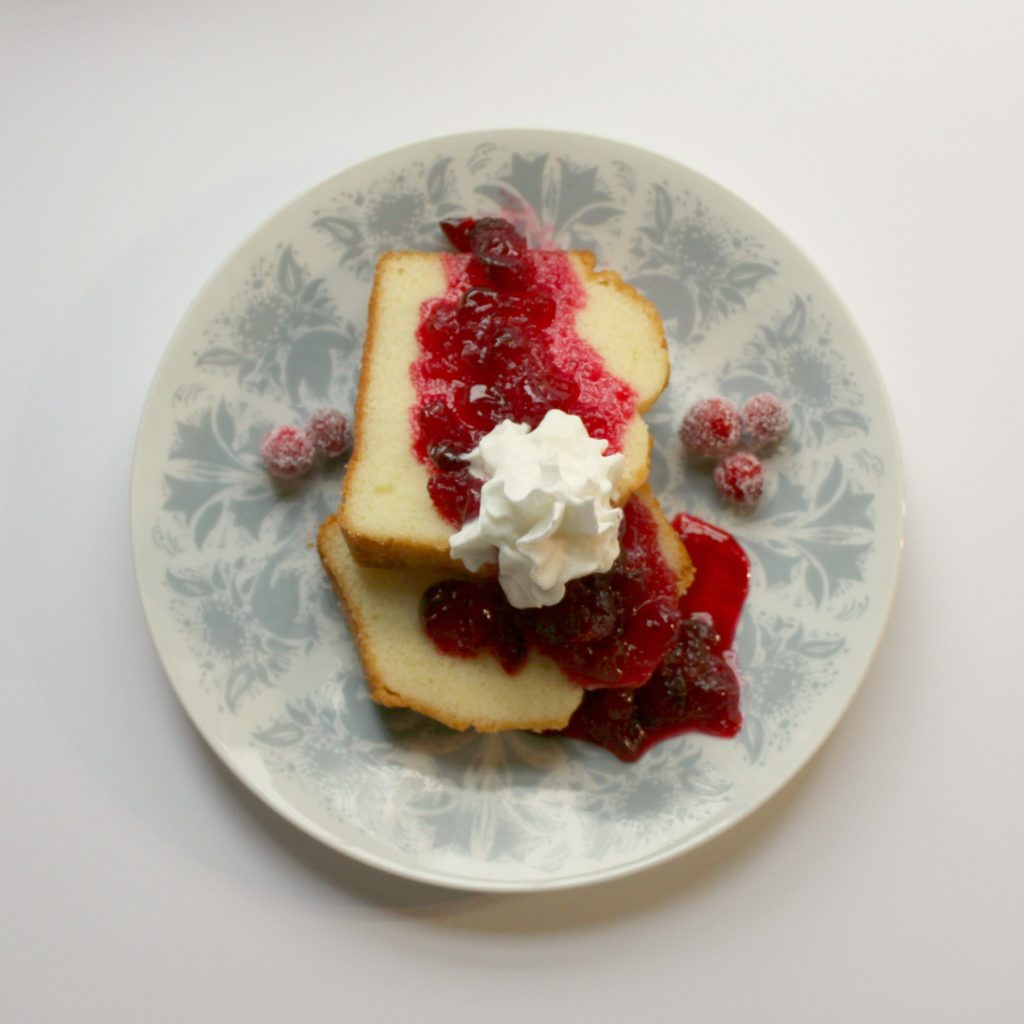 At this point, you can assemble your dish! Â Start with slices of pound cake, top with the cranberry sauce, add whipped cream on top, and garnish with the sugared cranberries.