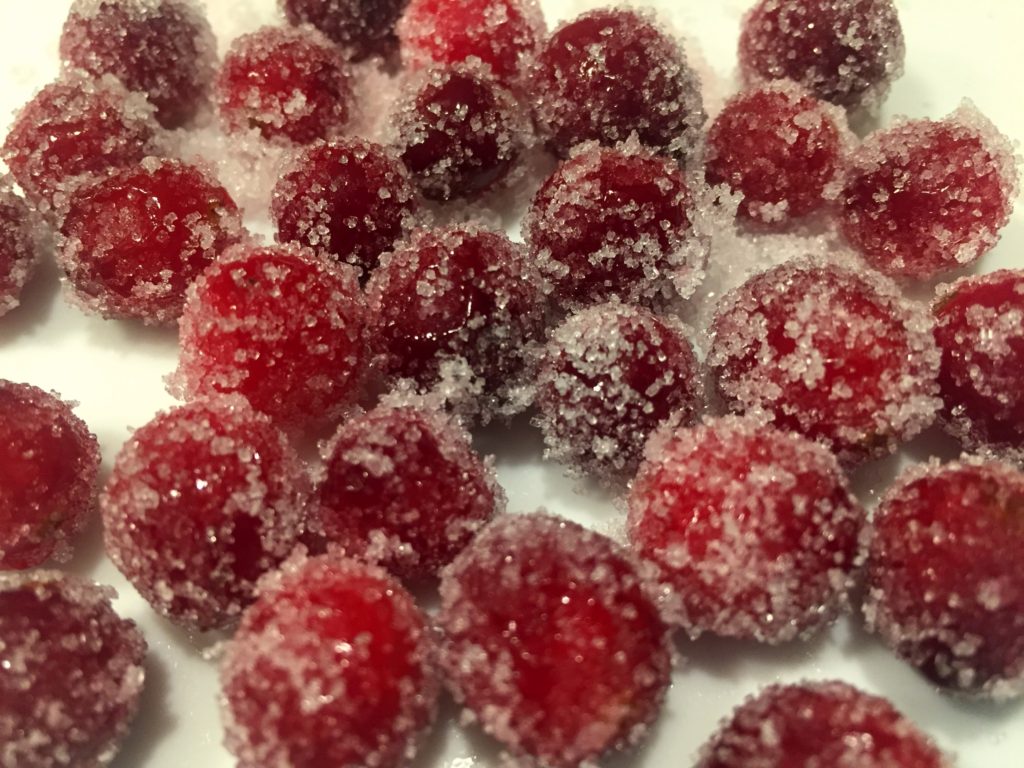 Once the cranberries are dry – after about an hour – they are ready to roll in sugar. Â If you need to wait longer, that is fine too – just pop them in the fridge and roll them in sugar when you are ready.
