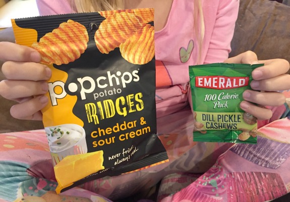 Our assortment included an assortment of things like bars and fruit snacks, but also some more fun snacks too. My daughter was most excited to try these two – Dill Pickle Cashews and Popchips in Cheddar & Sour Cream.