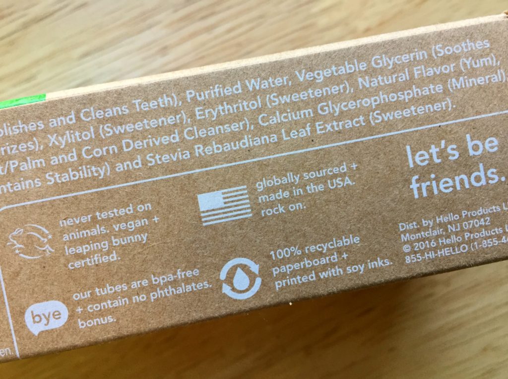 Take, for example, Hello Products. Their products are free of artificial sweeteners, artificial flavors, dyes, preservatives and microbeads – plus they also have recycled boxes, and have provided in over $350k in products to charity. Their products are never tested on animals. This is the kind of company I love to support!