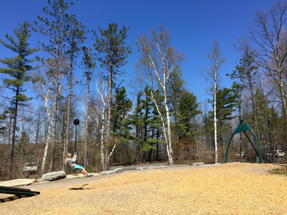 After we are done, we stop to take a snack break, or the kids head right to the playgrounds or zipline. There is a yellow playground close to the trailhead, then a younger kid’s playground, and if you keep walking, you’ll find a zipline and small rock wall. The kids love going on this and it is fun for all ages.