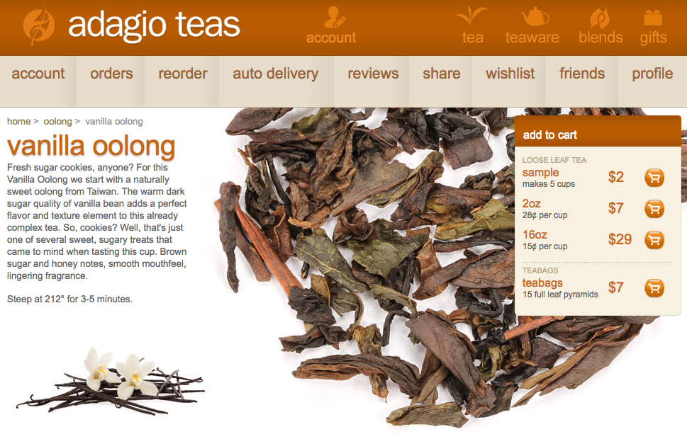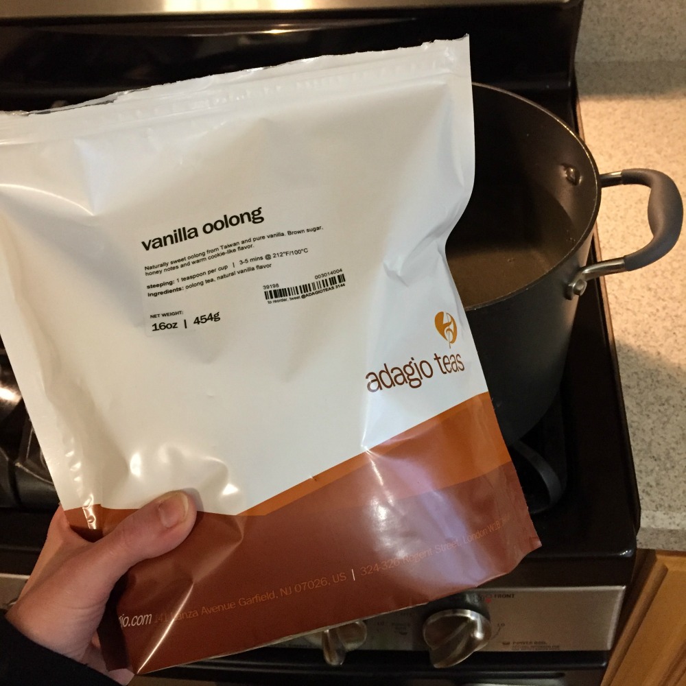 We are big coconut and vanilla fans in our household, so the first tea I chose was Vanilla Oolong. This tea is highly rated on Adagio.com, with 917 reviews! It was helpful to check out the reviews, photos of the loose tea and tea bags, ingredients, tea lore, other recommended teas, and more.