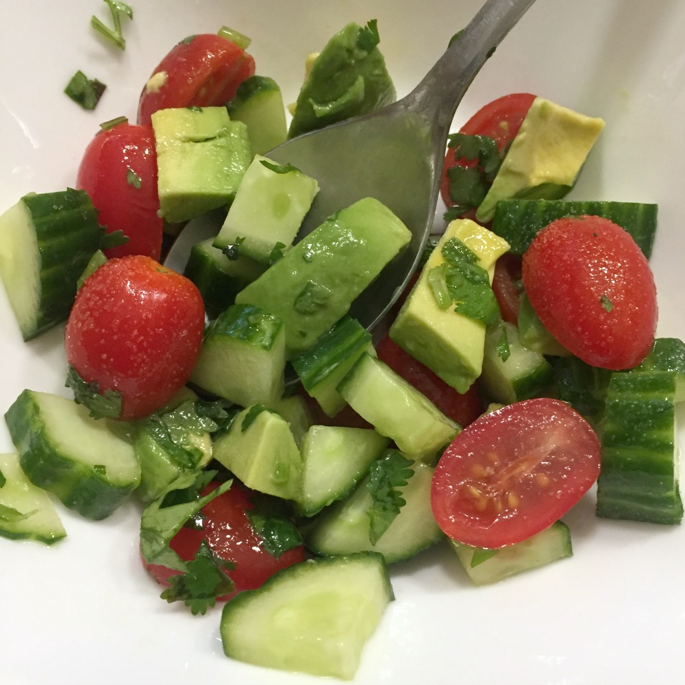 Mince a handful of fresh cilantro, and toss with the tomatoes and cucumber.