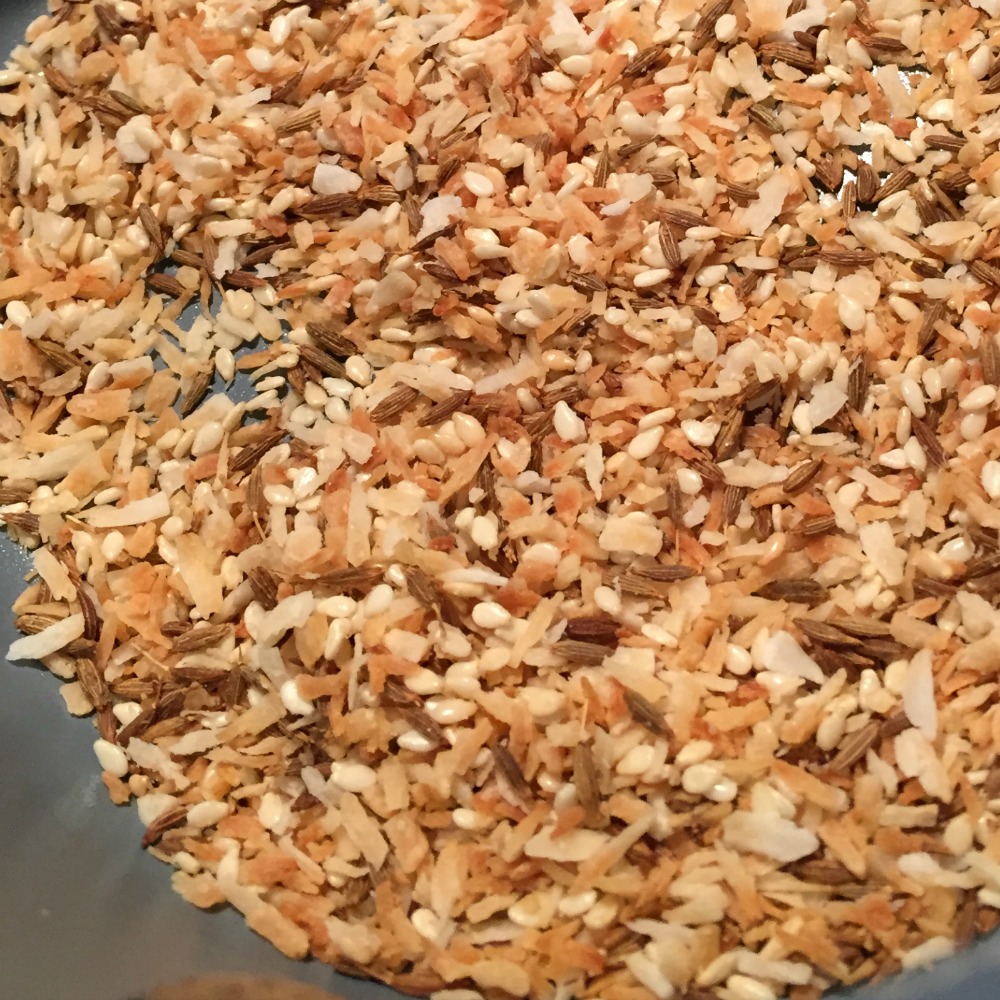 Toast cumin seeds in a skillet, adding the sesame seeds and coconut after about a minute. Continue toasting the mix for 3-5 more minute.