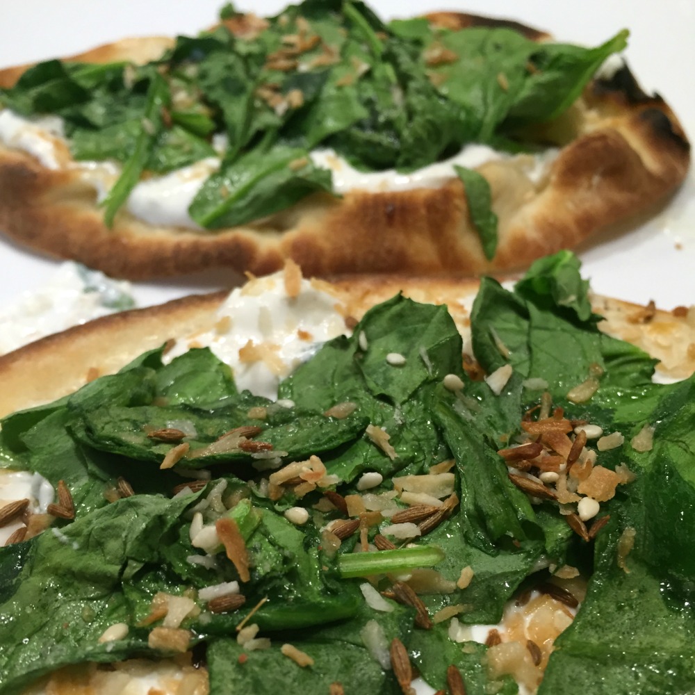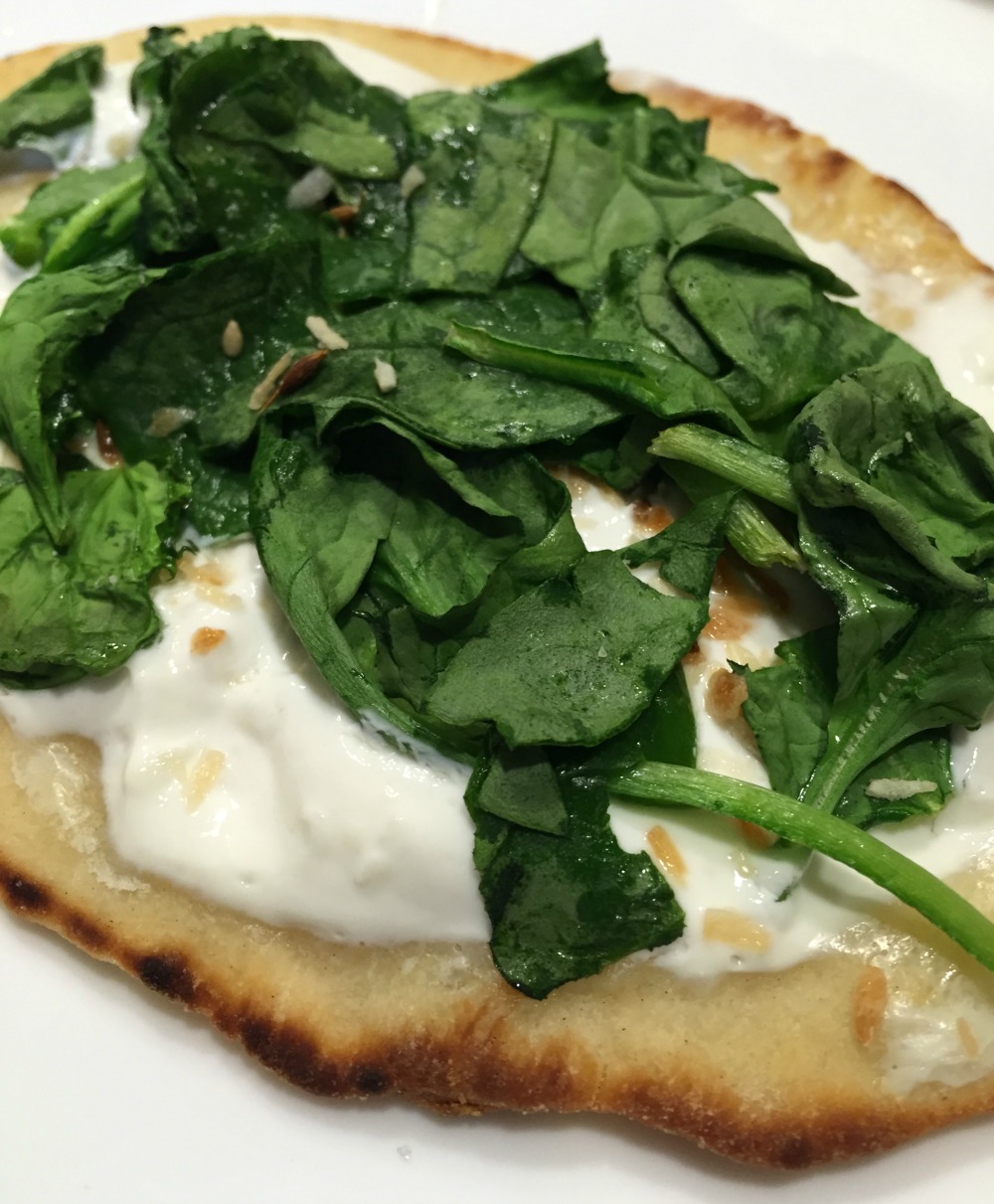 I simply toast the naan lightly. Microwave the spinach until it wilts (it doesn’t take long). Spread sour cream or yogurt on your naan, top with spinach, and then your spice mixture. The combination of bread, sour cream or yogurt, spinach and spices is so good!