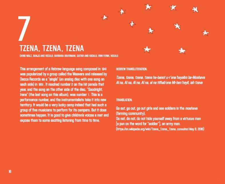 Renowned children’s performer Ella Jenkins has vivid memories of singing at summer camps, and if you were a camper, you must too! She and her friends invite you to share those experiences and celebrate her 60 years as a Folkways artist with this recording. Ella assembled a group of children, parents, and teachers from the Old Town School of Folk Music in Chicago, along with Tony and Kate Seeger from Camp Killooleet, to sing these classic camp songs, rounds, silly songs, and campfire sing-alongs with you. (from http://folkways.si.edu/)