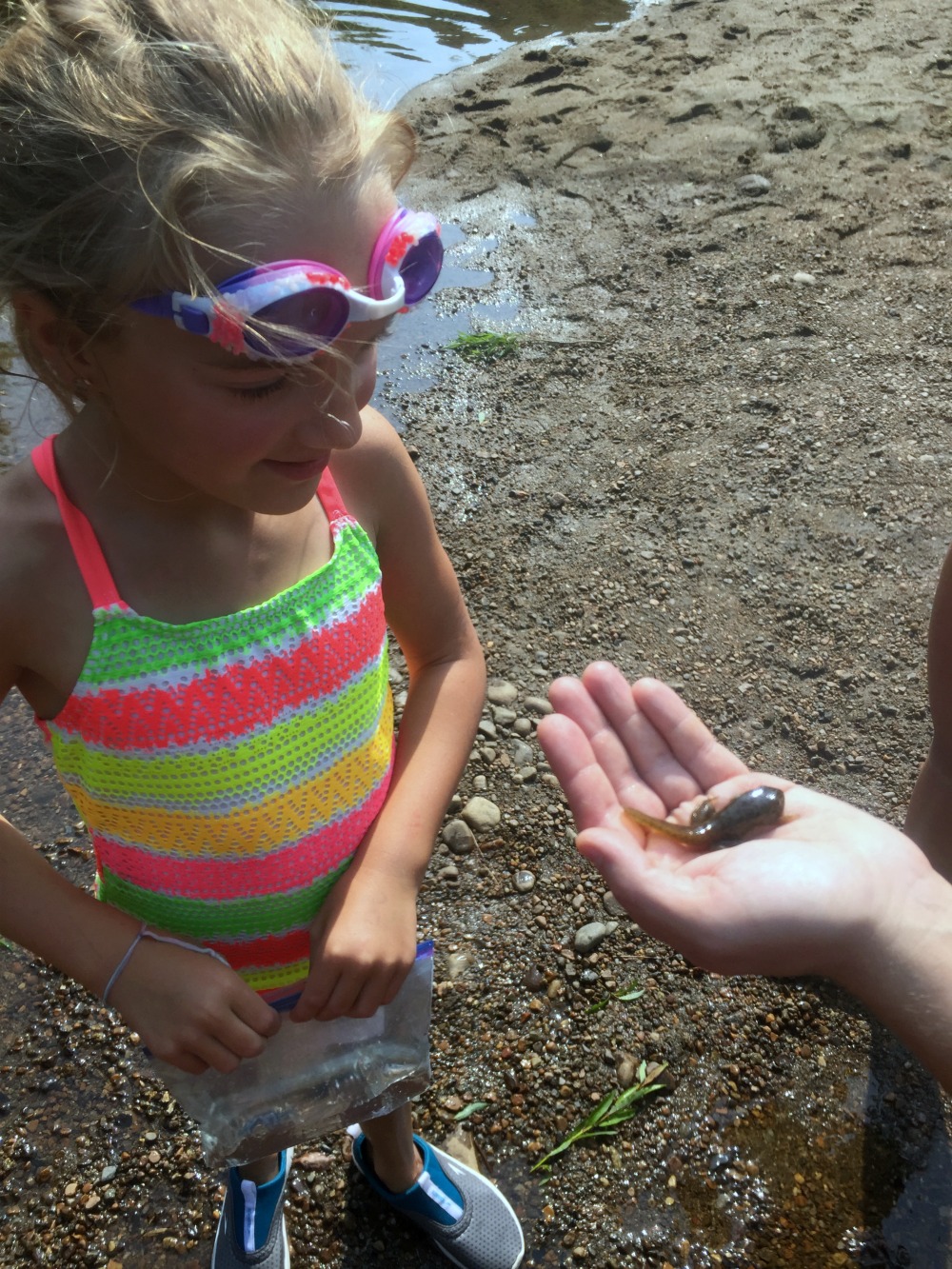 The kids found a young frog that still had a tadpole tail, and also saw fish, crayfish, snails and geese. They brought their goggles so they could go for a swim and see what is in the water.
